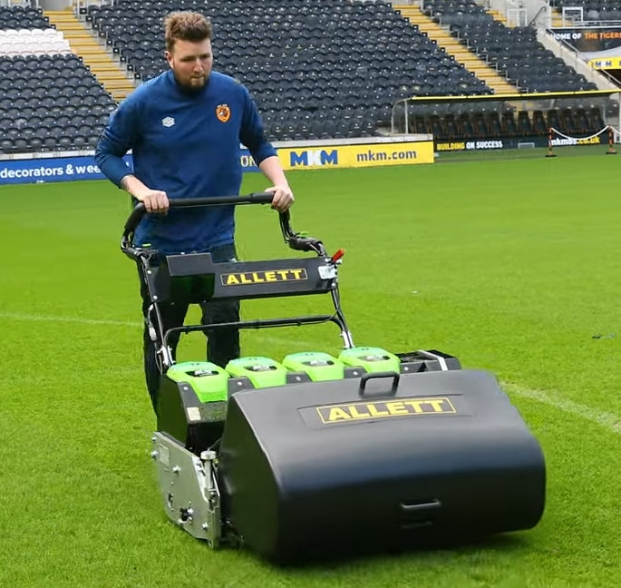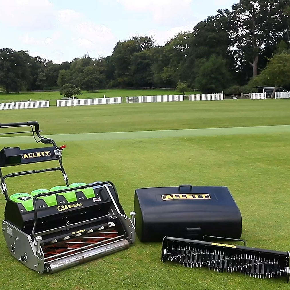 The Allett C34E delivers a wide range of professional turf maintenance functions from a single pedestrian controlled machine to suit most maintained turf areas.