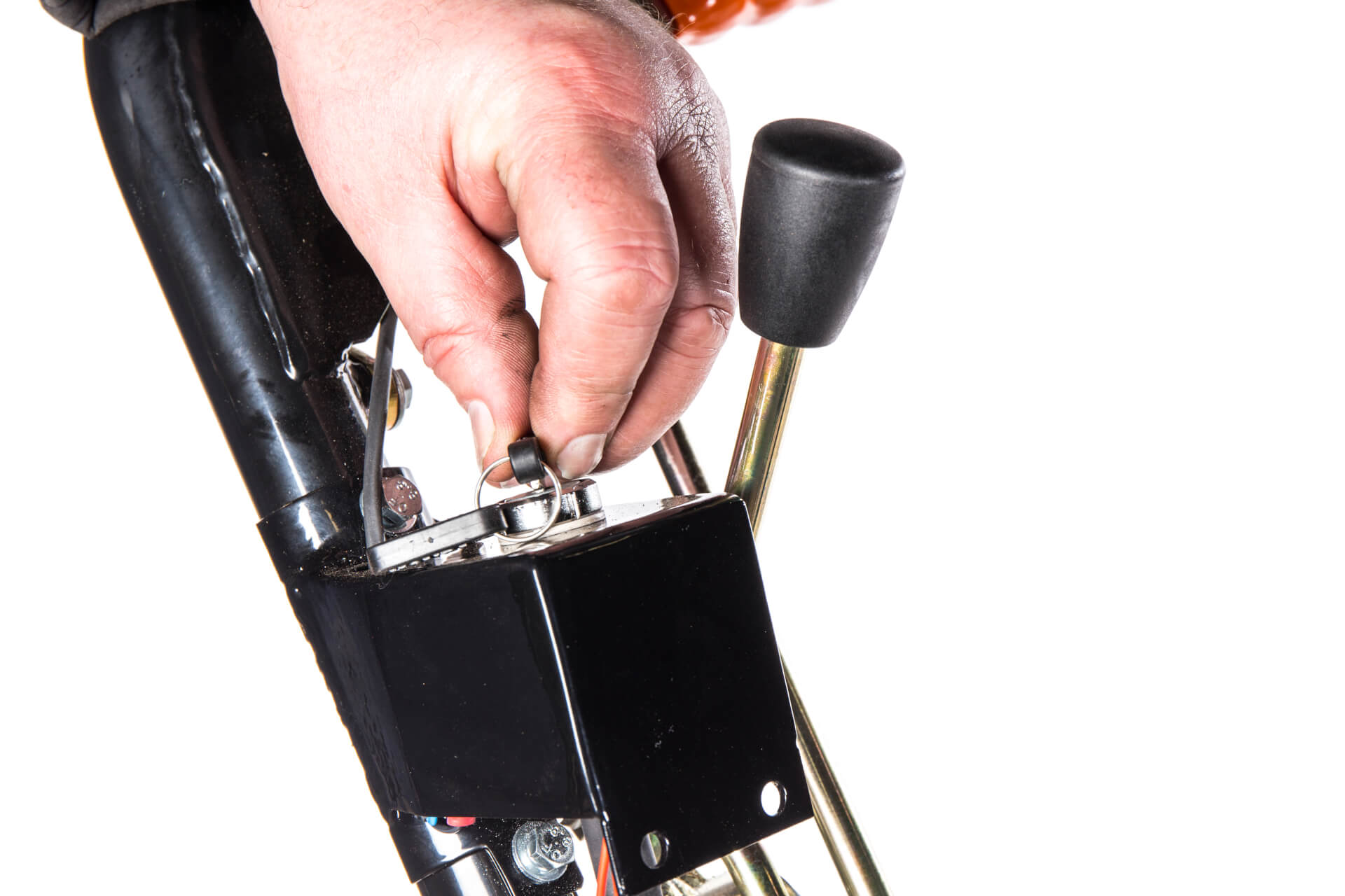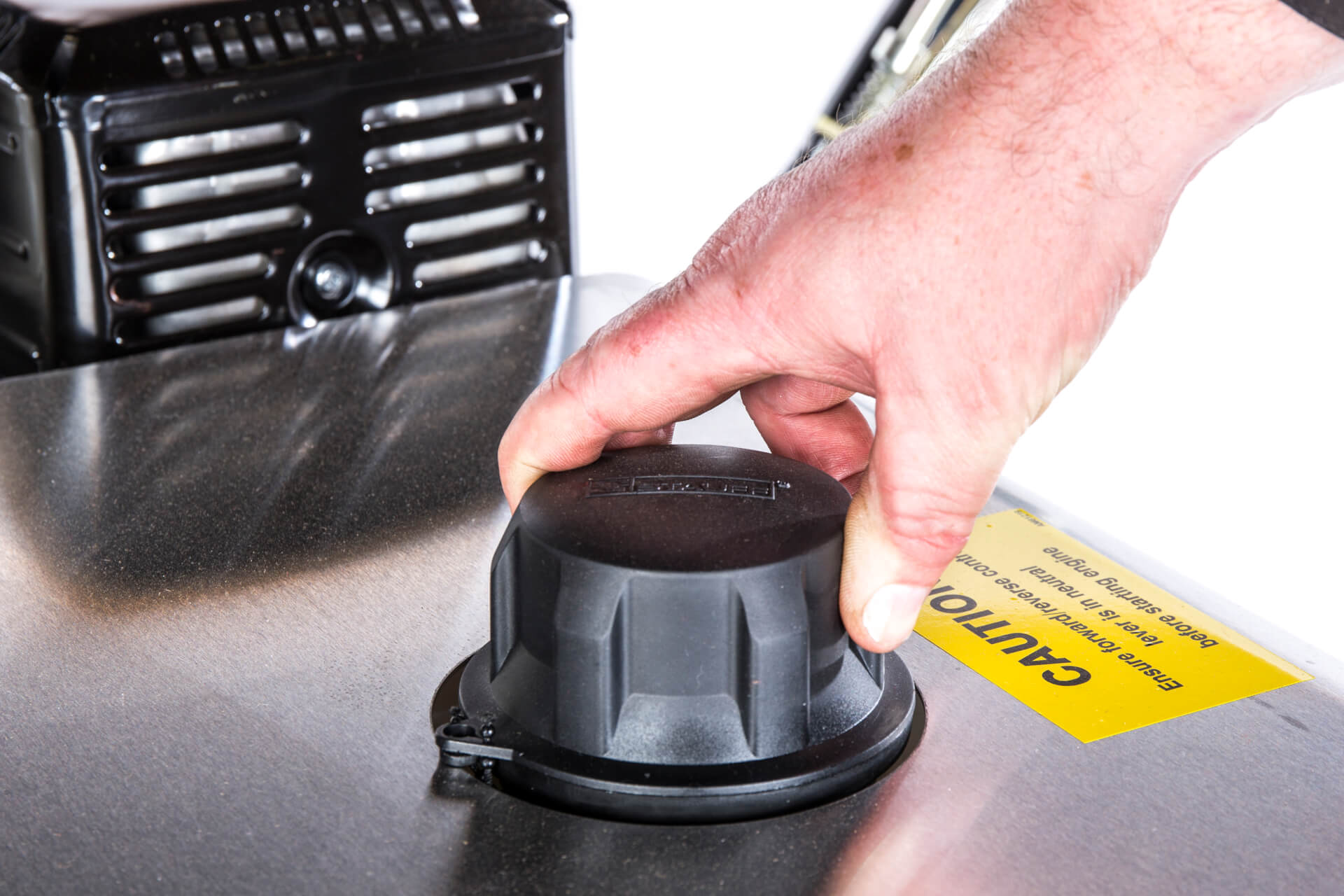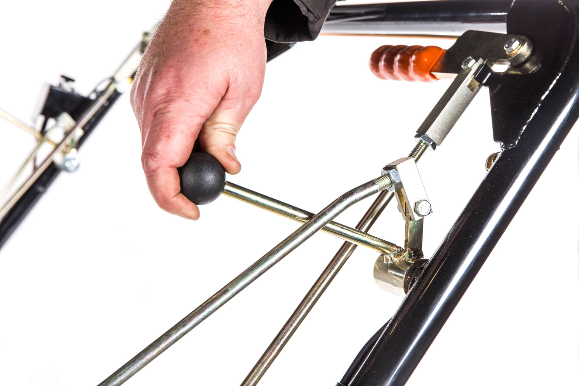 | Cylinder engagement | Handle-mounted lever engaging triple V belts via rods |