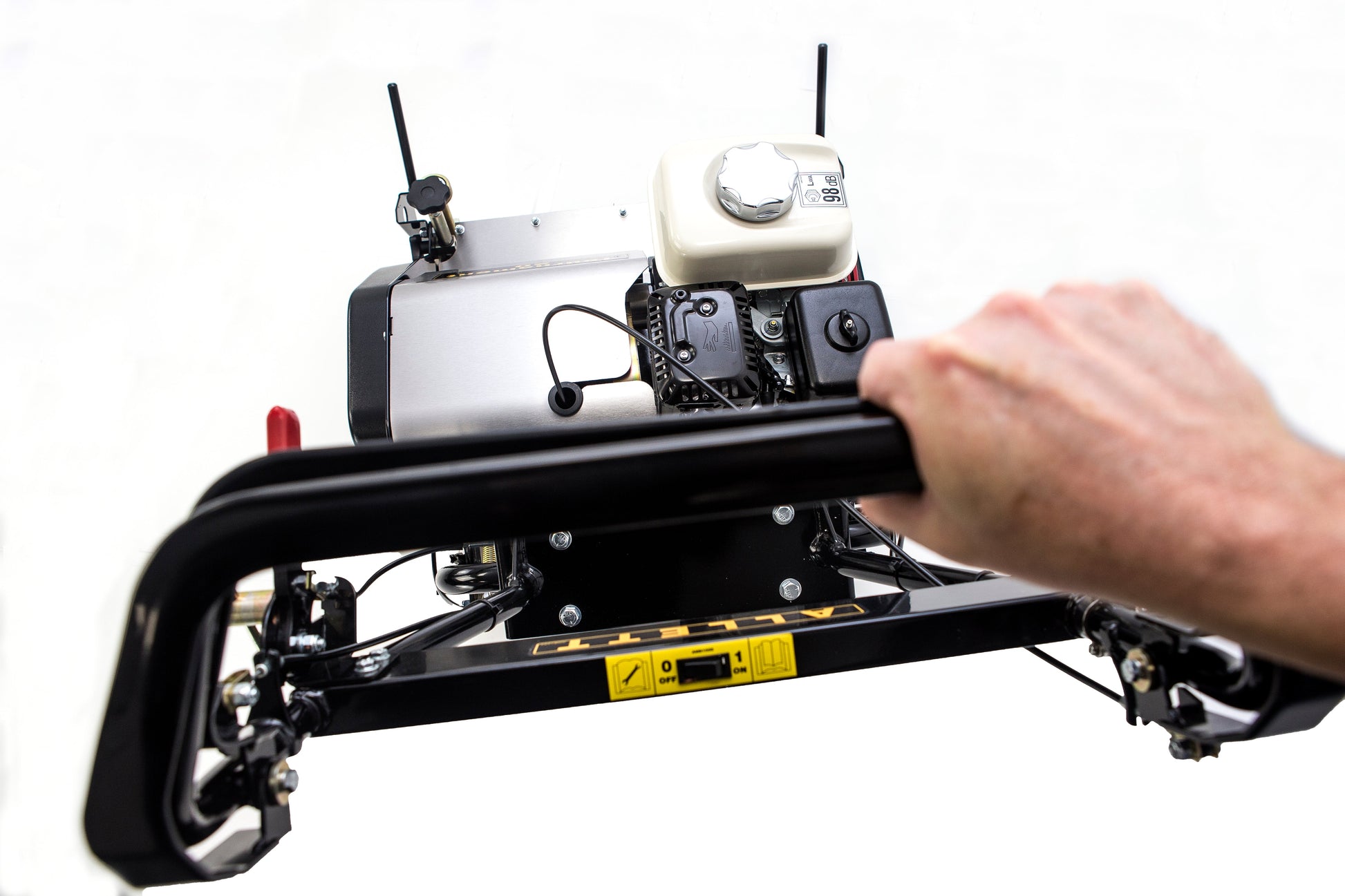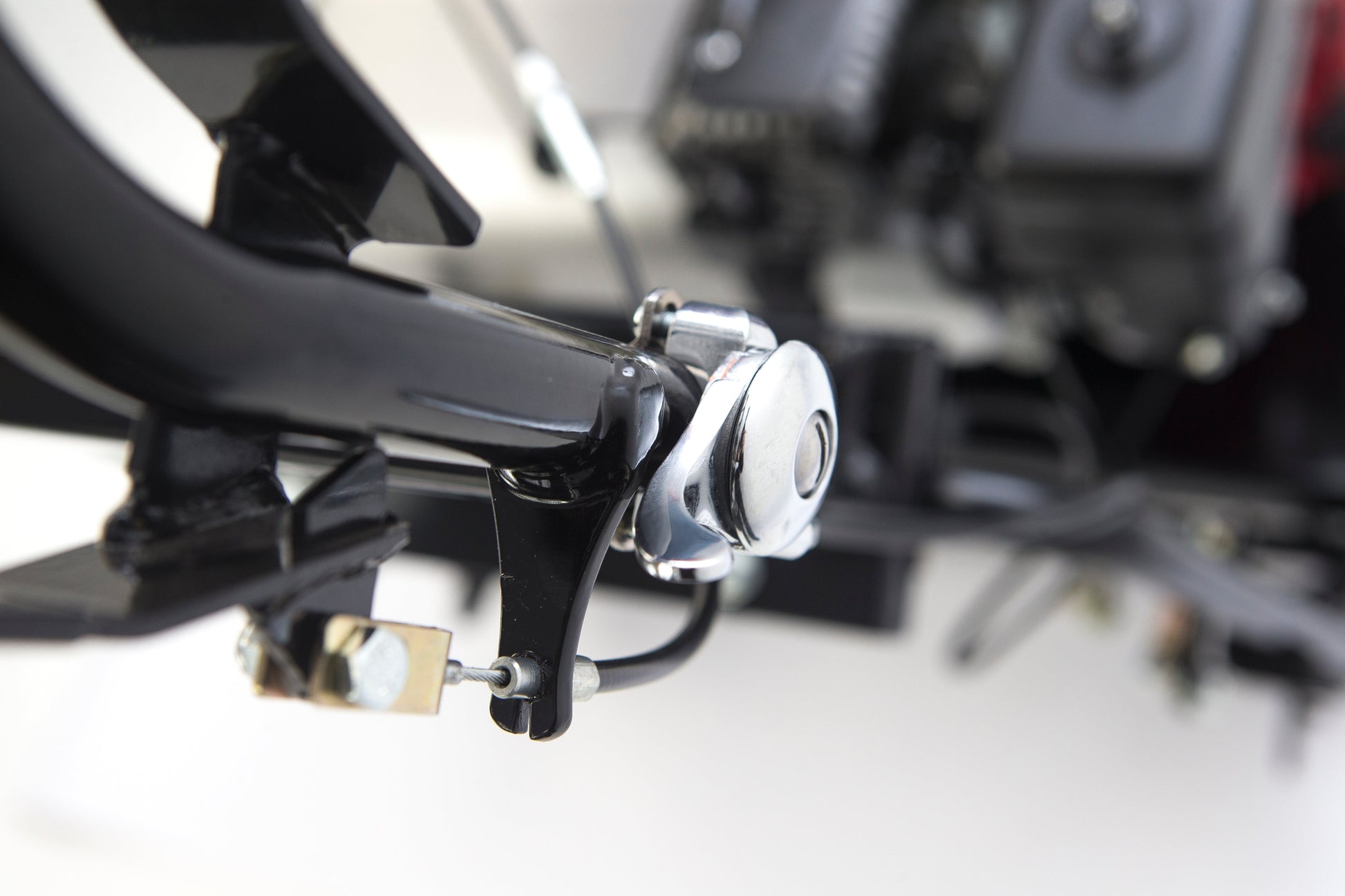 | Drive engagement | Handle-mounted lever engaging V belt drive via cable |
